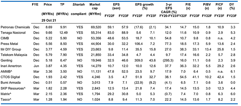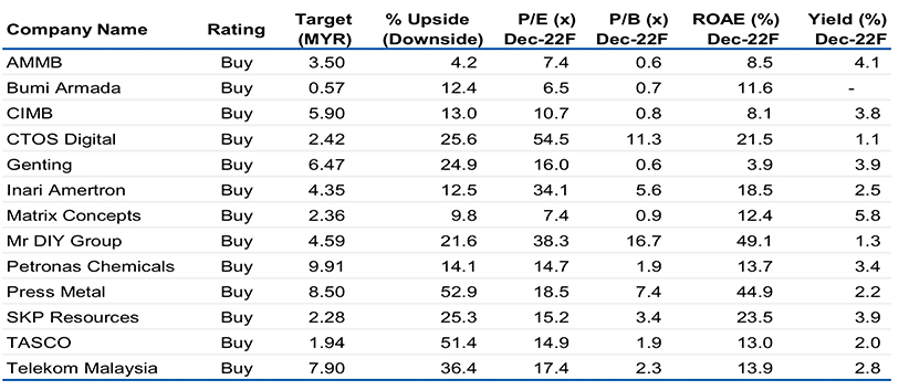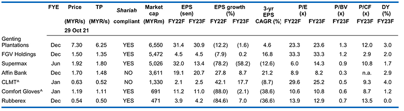Worst case impact of Cukai Makmur is 7-15% to net profit. In addition to the windfall tax changes, the Government is also proposing a new one-off tax called “Cukai Makmur” where companies with taxable income up to the first MYR100m will be subject to income tax at the rate of 24% – the remaining taxable income is subject to income tax at a rate of 33% for the Year of Assessment 2022. While there is no real clarity yet as to how this tax will be calculated, especially for those companies with overseas operations, we have calculated the worst case and best case scenarios for the stocks under our coverage. Under the worst case scenario, we have assumed the tax is applicable on group PBT, resulting in a net profit impact of 7-15% for the stocks under our coverage. Under the best case scenario, we have assumed the tax is only applicable on the PBT of the Malaysian operations, resulting in a net profit impact of 1-10% for the stocks under our coverage. We highlight that the best case scenario is also a conservative one, as it would largely depend on how each company is structured, and whether each subsidiary earns more than MYR100m each.