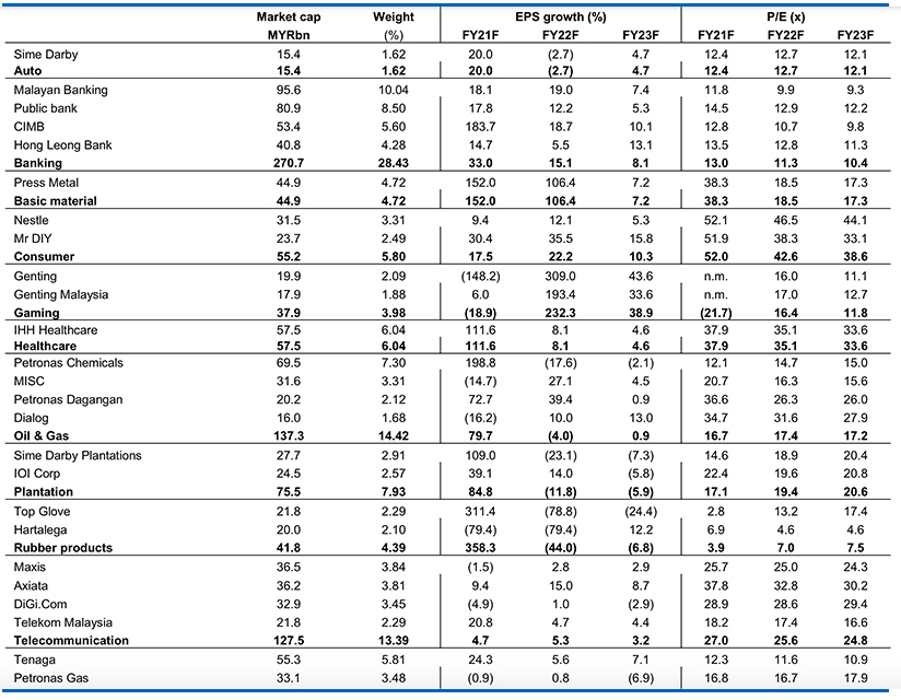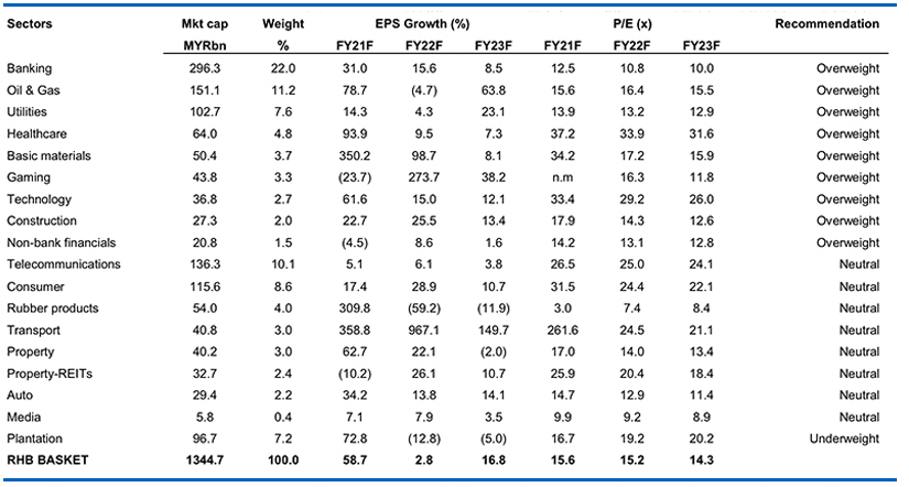 • Strategy. While the ongoing domestic economic recovery story will be supported by the consumer-friendly Budget 2022, evolving policy risks and the market’s adjustment to the broad scope of the windfall tax will add to market volatility. Given the overhanging external risks and lack of a clear roadmap to achieve further fiscal consolidation going forward, we expect the market to re-rate lower, even as forward P/Es spike higher with downside risks to FY22 earnings. Nonetheless, a sharp pullback could be an opportunity to re-weight into recovery plays at lower levels, including looking out for “bombed-out” stocks. OVERWEIGHT sectors include banks, healthcare, gaming, basic materials, oil & gas, transport, and logistics.