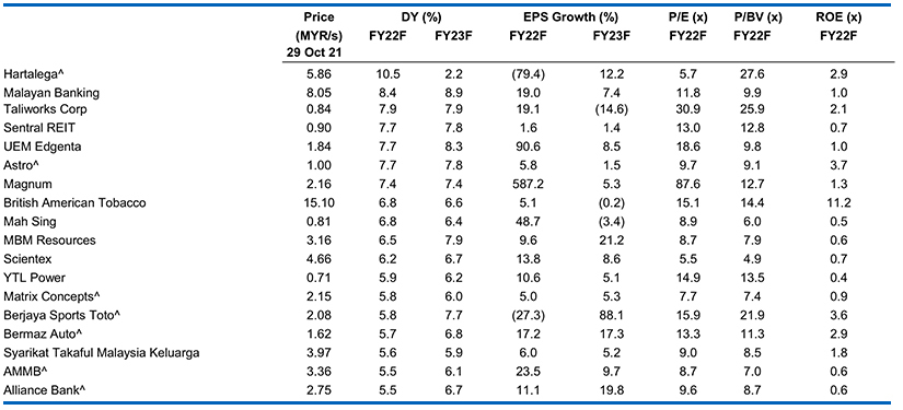 • Expansionary budget as expected. Budget 2022 will be the nation’s largest, with an allocation of MYR332.1bn. There were a slew of measures supporting the lower-income group and small businesses, coupled with a hefty MYR75.6bn allocation for development expenditure (DE). The extension of the sales tax exemption, along with tax exemptions for electric vehicles (EVs), means that the auto and consumer sectors are the outright winners. Construction lacked emphasis on significant infrastructure projects to capture investor imagination. Property missed out on yet another opportunity to revive the moribund sector.