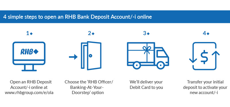 Introducing Malaysia’s first online account opening channel with a rider service. Existing RHB Bank customers can now set up a new deposit account/-i easily through a simple three step process that will take no longer than 10 minutes. After clicking on the designated link found on the RHB Bank homepage, they would need to fill in a form with their personal information, agree to the terms and conditions and transfer a minimum initial deposit of RM1,000 to activate the account/-i.