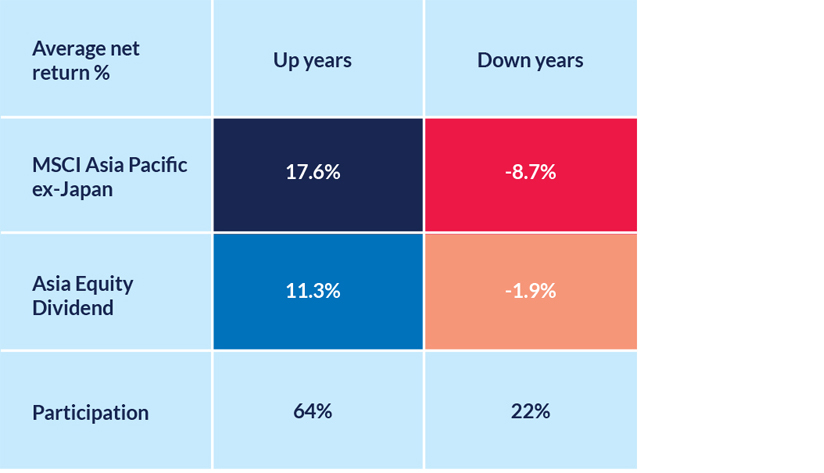 Investors who want to capitalise on China’s growth may also consider exposure to other countries within the Asia Pacific region. Its positioning is agile and strategic as well, with 64% participation in the up market cycle and only 22% in the down cycle, providing investors with a smoother ride.
