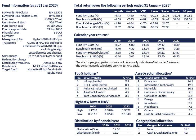The Manager wishes to highlight the specific risks of the TA Global Absolute Alpha-i Fund are External Investment Manager’s Risk, Shariah non-compliance Risk, Shariah Status Reclassification Risk, Profit Rate Risk, Islamic Collective Investment Scheme Risk, Shariah-compliant Equity Risk, Islamic Financial Derivative Instruments (Islamic FDI) Risk, Currency Risk, Currency Risk, Country Risk, Liquidity Risk, Concentration Risk, Counterparty Risk and Distribution Out of Capital Risk. The specific risks of the RHB ESG Multi-Asset Fund are Management Risk, Liquidity Risk, Currency Risk, Country Risk, Interest Rate Risk, General Risks, Financial Markets, Counterparties and Service Providers Risk, Tax Considerations Risk, Share Class Contagion Risk, Currency Risk Base Currency, Global Financial Market Crisis and Governmental Intervention Risk, Impact of Natural or Man Made Disasters and Disease Epidemics Risk, Recent Market Events Risk, Derivatives Risk, Securities Lending Risk, Risks Relating to Repurchase Agreements, Risks Relating to Reverse Repurchase Agreements, Counterparty Risk, Counterparty Risk to the Depositary, Fund Liability Risk, Market Leverage Risk, Repurchase and Reverse Repurchase Agreements Risk, MiFID II Risk, Cybersecurity Risk, Tax Risk, Sustainability Risk, Other Risks, Liquidity Risk, Options Strategies Risk, Fixed Income Transferable Securities Risk, Investment in High Yield Debt Securities Risk, Asset backed Securities Risk, Mortgage backed Securities Risk, Contingent Convertible Bonds Risk, Equity Risks, Money Market Instruments Risk, Emerging Markets Risk, Sovereign Debt Risk, Bond Downgrade Risk Bank Corporate Bonds “Bail in” Risk, Investments in the PRC Risk, Investments in Russia Risk, Potential implications of Brexit Risk, Euro and Euro Zone Risk, Exposure to Commodities within Exchange Traded Funds Risk, ESG Investment Policy Risk, MSCI ESG Screening Criteria Risk, Specific Risks Applicable to Investing via the Stock Connects, Specific Risks Associated with China Interbank Bond Market. The specific risks of the RHB Big Cap China Enterprise Fund are Currency Risk, Country Risk, Market Risk and Particular Security Risk. The specific risks of the Principal Asia Pacific Dynamic Income Fund are Returns not guaranteed Risk, Market Risk, Inflation Risk, Manager Risk, Financing Risk, Stock Specific Risk, Country Risk, Liquidity Risk, Currency Risk, Credit and Default Risk, Interest Rate Risk, Risk associated with investing in CIS and Risk of investing in emerging markets. The specific risks of the RHB Asia Pacific Equity Dividend Fund are Management Risk, Liquidity Risk, Currency Risk, Country Risk, Interest Rate Risk, Investment Risk, Equity Risk, Political, Economic and Social Risks, Market Risk, Dividend-paying Equity Risk, Emerging Markets Risk, Concentration Risk, Smaller Companies Risk, Risk associated with high volatility of the equity market in the Asian region, Hedging Risk, Derivatives Risk, Leverage Risk, RMB Currency Risk, Real Estate Investment Trusts (REITs) Risk, Special Purpose Acquisition Company (SPAC) Risk, Payment of Distributions Out of Capital Risk, Low Level of Monitoring Risk, Legal, Tax and Regulatory Risk, Valuation Risk, Volatility Risk, Custodial Risk, Counterparty Risk, People’s Republic of China (PRC) Tax Risk Consideration, Early Termination Risk, Technology Related Companies Risk, Cross-class Liability Risk, China Market Risk, Risk associated with foreign shareholding restrictions on China A-Shares, Risk associated with short swing profit rule, Risks associated with China Connect, Risks associated with the investments in stocks listed on the Beijing Stock Exchange and/or the ChiNext Board of the SZSE and or the Science and Technology Innovation Board (“STAR Board”) of the SSE, Risks associated with equity-linked notes and participation notes, Risks associated with collateral management and re-investment of cash collateral, London Interbank Offer Rate (“LIBOR”) discontinuance or unavailability risk. The specific risks of the RHB Manulife India Equity Fund are Manager’s Risk, Market Risk, Liquidity Risk, Country Risk, Currency Risk, Small-Cap Risk, Natural Resources Sector Risk, Taxation Risks, Financial Derivative Instruments other than for Investment Purpose Risk, Foreign Exchange Risks, Liquidity and Volatility Risks, Emerging Markets Risks, Political and Regulatory Risks, Custodial, Clearance and Settlement Risk, Credit Downgrade Risk, Macroeconomic Risk Factors, Global Commodity Prices Risk, Oil Price Risks, Government Policy Risks, Risk of Price Controls, Risk of Stock Market Controls, Geopolitical Risks, Labour Market Risks, Environmental Regulation Risks, Swing Pricing Risk and other general risks are elaborated in the Information Memorandum.