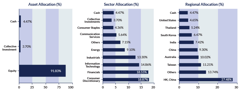 The fund aims to provide regular income by investing primarily in the Asia Pacific ex-Japan region, while achieving capital appreciation over the medium to long term. Under general market conditions, the fund's investment will focus on high dividend yielding equities of companies, sustainable dividend payments and/or will exhibit above-average growth potential when compared to its industry or the overall market at the point of purchase.