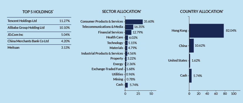 This fund suits those looking to participate in the fast-growing Chinese economy and are willing to take on a little more risk for long-term capital growth. It primarily invests in equities and equity-linked securities issued by companies whose businesses are in China and are listed there and/or other markets. As of end of January 2023, the fund’s highest exposure is in Hong Kong, at 82%.
