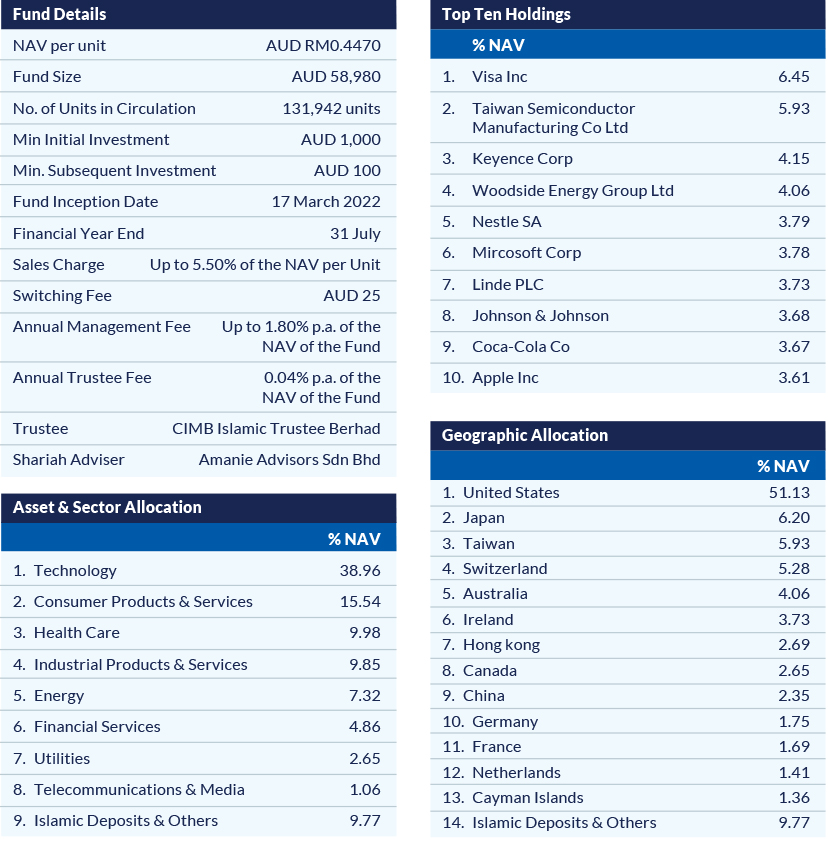 In the final quarter of 2022, the USD Money Market Fund continued to see inflows attracted by the potential USD appreciations and high-yields in USD-based fixed income assets. Justifying this movement was the fund’s 4% growth in ringgit terms for 2022.