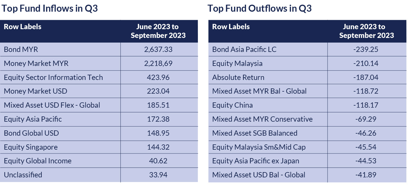 Malaysian bond funds ranked top in terms of inflow, suggesting that investors were under the belief that Bank Negara Malaysia (BNM) had reached the peak of its rate hike cycle. On the foreign fixed-income side, global bond funds had a slight edge over Asia Pacific bond funds. In the equities market, global technology equities funds were a firm favourite, while investors shied away from various Malaysian equity strategies.