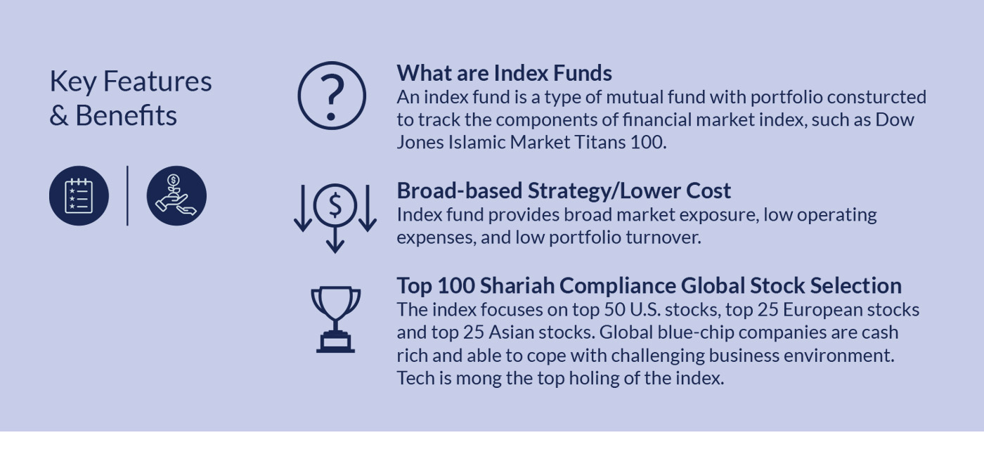 This type of fund is designed to track components of equity market indices, such as the Dow Jones Islamic Market Titans 100. Index funds offer broad market exposure, low operating costs, and minimal portfolio turnover.