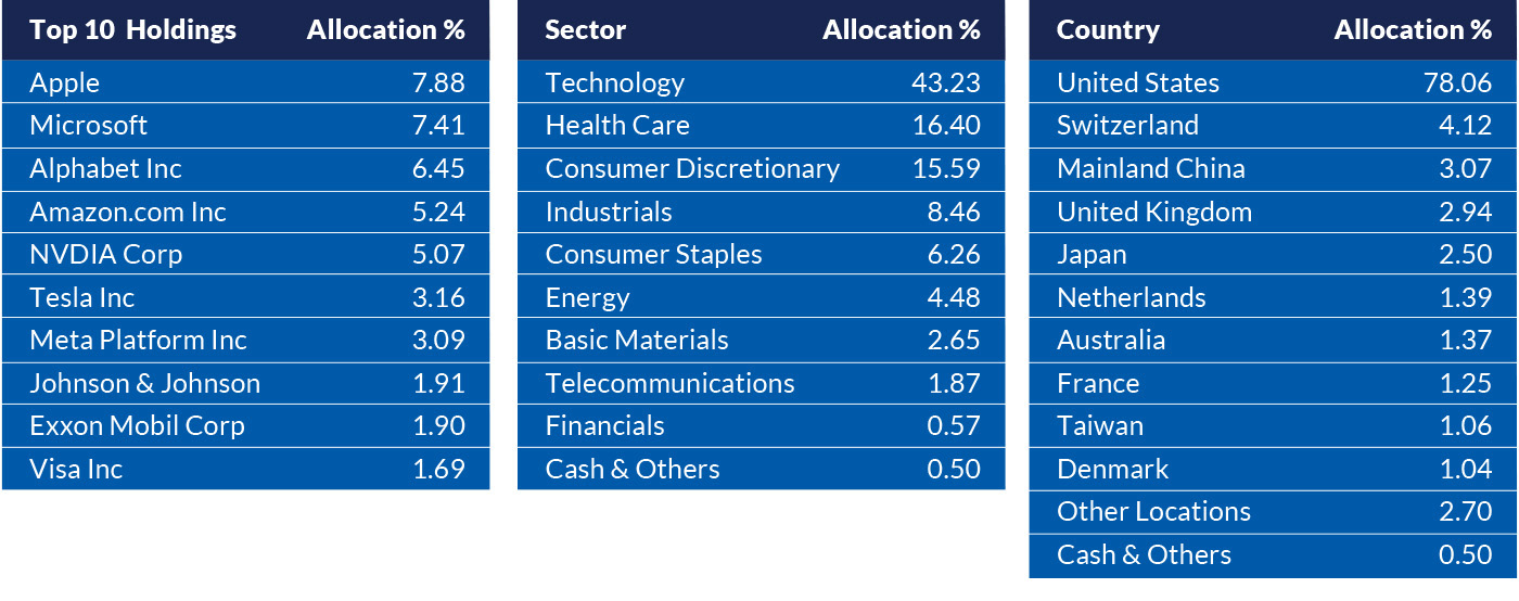 In addition to U.S. tech, both funds also have exposure to Asian technology stocks, such as Tencent and TSMC, which are key contributors to the region’s equity market. TA Global Technology has a commendable track record in Malaysia and is one of the top-performing technology funds in the market. Year to date, the fund has seen an impressive increase of 23.40% (as of 30 September 2023). Its strength lies in its focus on the five powerful secular themes for growth: Fintech, Internet 3.0, Next Generation Infrastructure, AI and Process Automation and Electrification. The fund leans more towards FAANG stocks: Meta (META) (formerly known as Facebook), Amazon (AMZN), Apple (AAPL), Netflix (NFLX); and Alphabet (GOOG) (formerly known as Google).