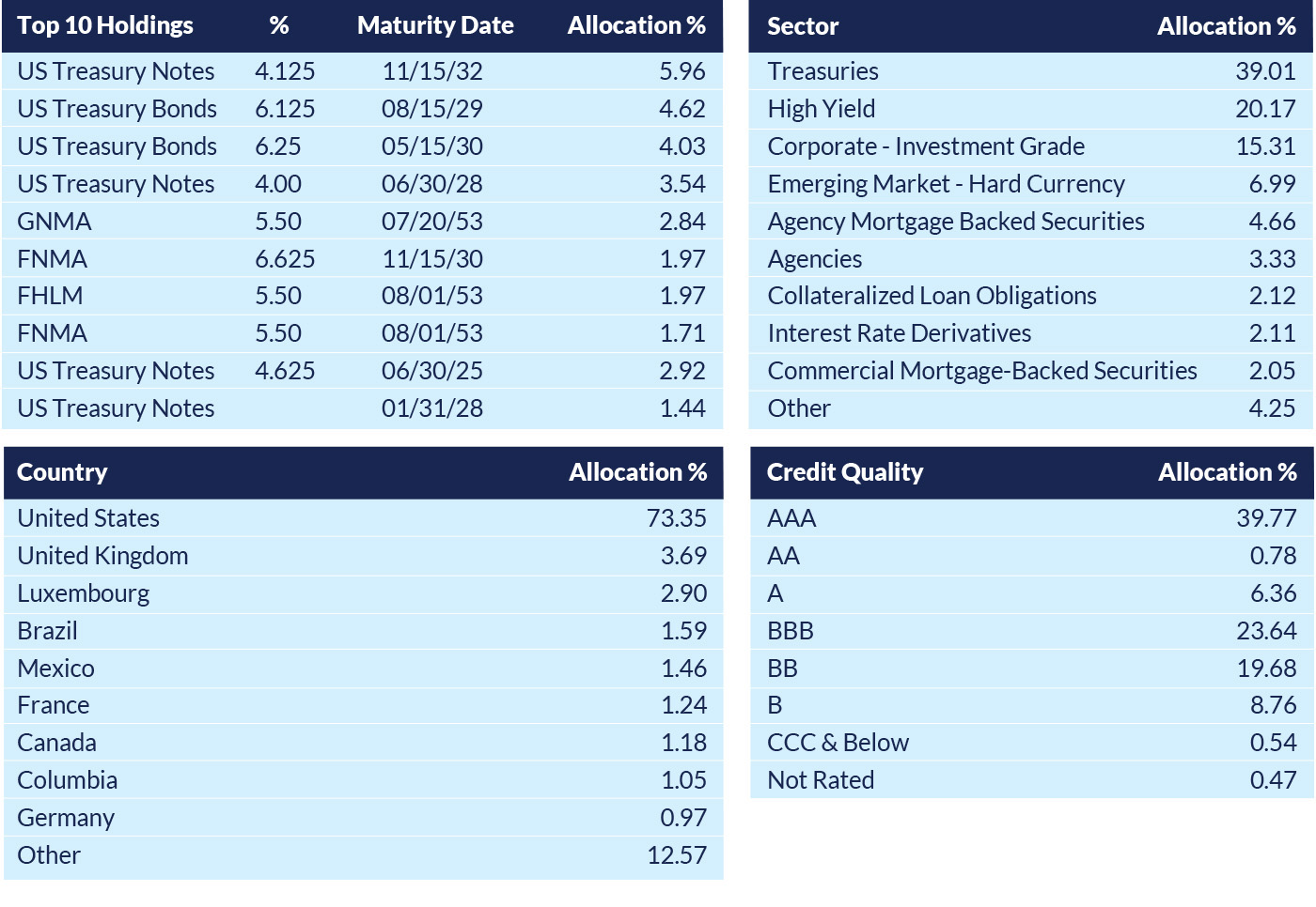 This fund offers a yield of 6.59% with a duration of 5.55 years. This diversified portfolio of more than 1,000 holdings is mainly exposed in US treasuries, while the fund manager also aims to create excess returns from sources like high-yield bonds and emerging market hard currency bonds. At the feeder fund level, currency hedging is implemented to mitigate foreign currency risks.