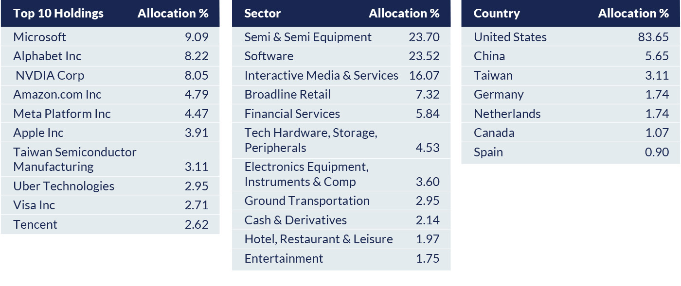 The fund has its highest exposure in the U.S. equity market, with a notable bias towards technology. The top holdings are primarily mega-cap technology stocks.