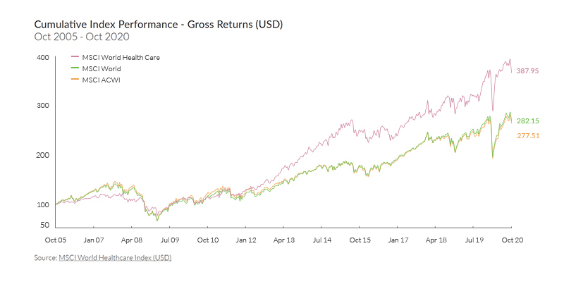 The MSCI World HealthCare Index had been outperformed by the MSCI World and MSCI ACWI for almost a decade (see MSCI World Performance table). While not immune to the broader volatility in the market, the healthcare sector has displayed relative resilience over others.