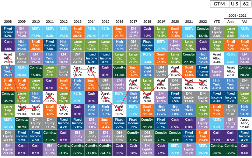 Large cap: S&P 500, Small cap: Russell 2000, EM Equity: MSCI EME, DM Equity: MSCI EAFE, Comdty: Bloomberg Commodity Index, High Yield: Bloomberg Global HY Index, Fixed Income: Bloomberg US Aggregate, REITs: NAREIT Equity REIT Index, Cash: Bloomberg 1-3m Treasury. The “Asset Allocation” portfolio assumes the following weights: 25% in the S&P 500, 10% in the Russell 2000, 15% in the MSCI EAFE, 5% in the MSCI EME, 25% in the Bloomberg US Aggregate, 5% in the Bloomberg 1-3 Treasury, 5% in the Bloomberg Global Yield Index, 5% in the Bloomberg Commodity Index and 5% in the NAREIT Equity REIT Index. Balanced portfolio assumes annual rebalancing. Annualized (Ann.) return and volatility (Vol.) represents period from 12/31/2007 to 12/31/2022. All data represents total return for stated period. The “Asset Allocation” portfolio is for illustrative purposes only. Past performance is no indicative of future returns.