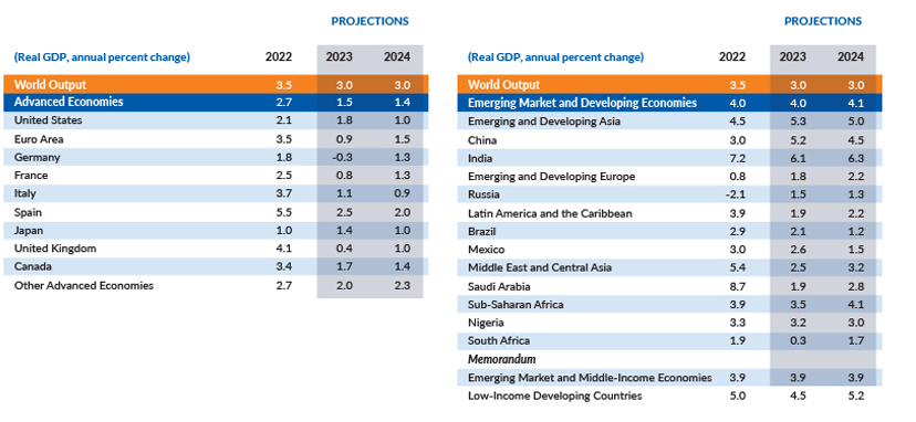 (starting in April 2022) shown in the 2022 column. India’s growth projections are 6.6 percent in 2023 and 5.8 percent in 2024 based on calendar year.