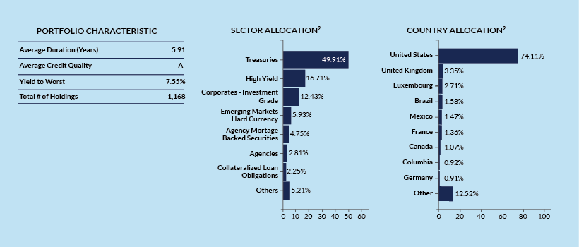 This fund has a diversified portfolio of more than 1,000 holdings, with most of its exposure in U.S. treasuries. At the same time, the fund manager aims to create excess returns from sources like high-yield bonds and emerging market hard currency bonds. At the feeder fund level, currency hedging is implemented to mitigate foreign currency risks. This fund offers a yield of 7.55% with a duration of 5.91 years.
