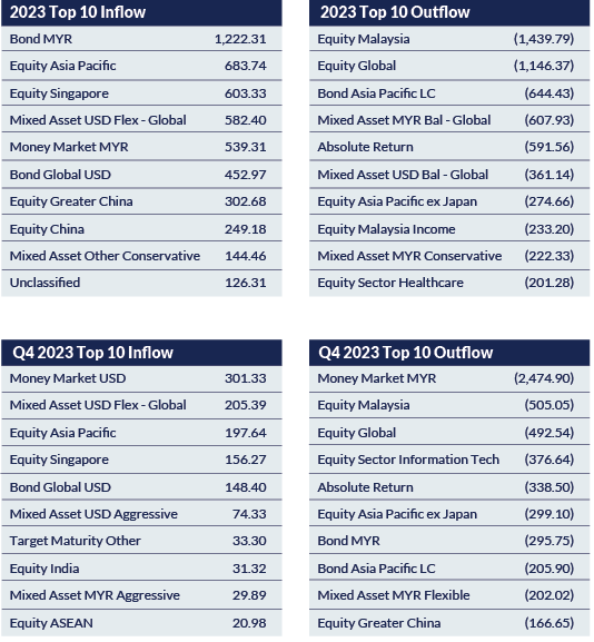 The ringgit’s persistent weakness against the US dollar throughout the year led to the influx of US dollar denominated funds. This migration was also reflected in Malaysian equities, which saw the most significant outflow among equity funds in 2023. This was not unique to Malaysian equities, however, as there was also considerable outflow across global equities, information technology, absolute return, and Asia Pacific ex-Japan strategies. The outflow effect spilled over into other equity-related funds focusing on Japan, Singapore, India, and the ASEAN region.