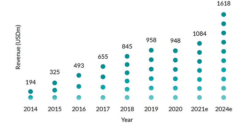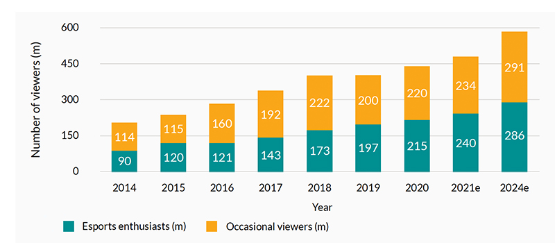 Esports has seen its revenues grow from USD194 million in 2014 to USD948 million in 2020 representing a CAGR of 30.2% per annum. Thanks to expected growth in viewership and sponsorship, Newzoo expects esports revenue to grow at a CAGR of 14.4% per annum to USD1.6 billion in 2024.