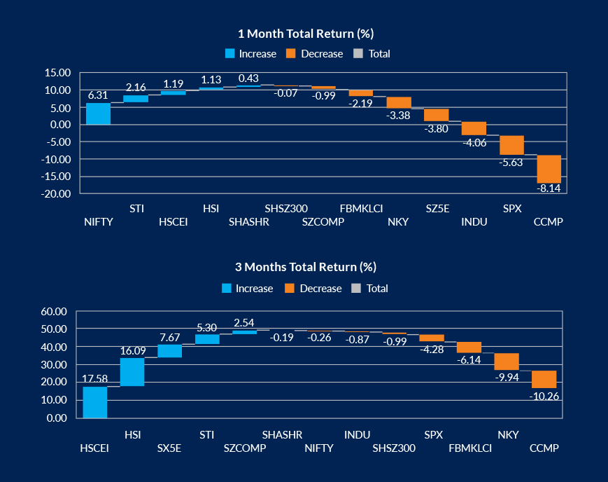 Emerging markets outpaced developed ones over both one-month and three-month periods, with the notable exception of FBM KLCI, which saw a decline. Developed markets, particularly US indices like the NASDAQ and the S&P 500, experienced headwinds, due to political instability and the renewed AI battle with China. As these markets contended with such challenges, investors turned to emerging markets, particularly India and China-related indices, suggesting a shift in focus towards growth opportunities in these regions.