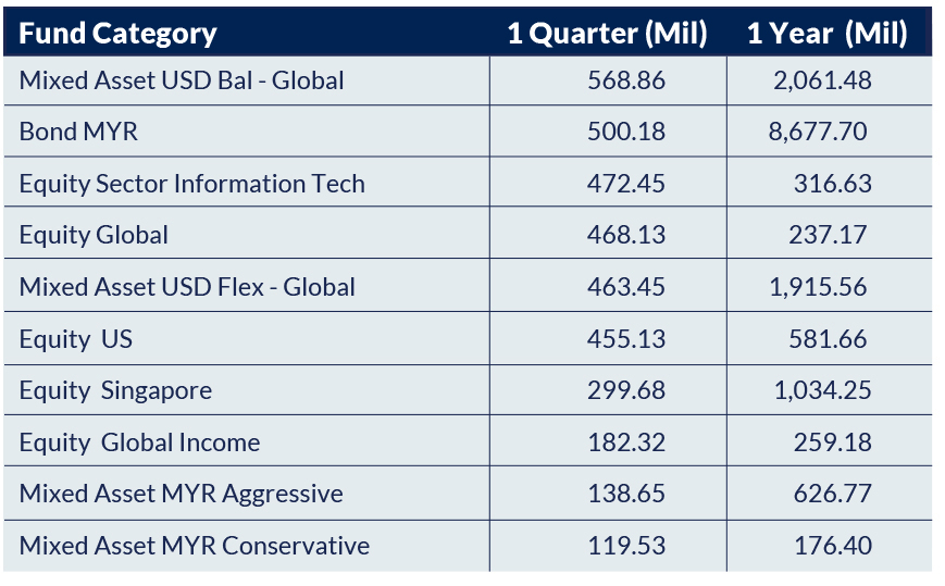 At the same time, USD-denominated global mixed asset funds dominated inflows, with the Mixed Asset USD Balanced – Global and Mixed Asset USD Flex – Global categories attracting RM568.86 million and RM463.45 million, respectively, over the last quarter. Over the past year, these strategies drew RM2.06 billion and RM1.92 billion, highlighting strong investor preference for diversified, globally exposed portfolios. This trend reflects a broader pursuit of stability, currency diversification, and tactical flexibility in a volatile environment.