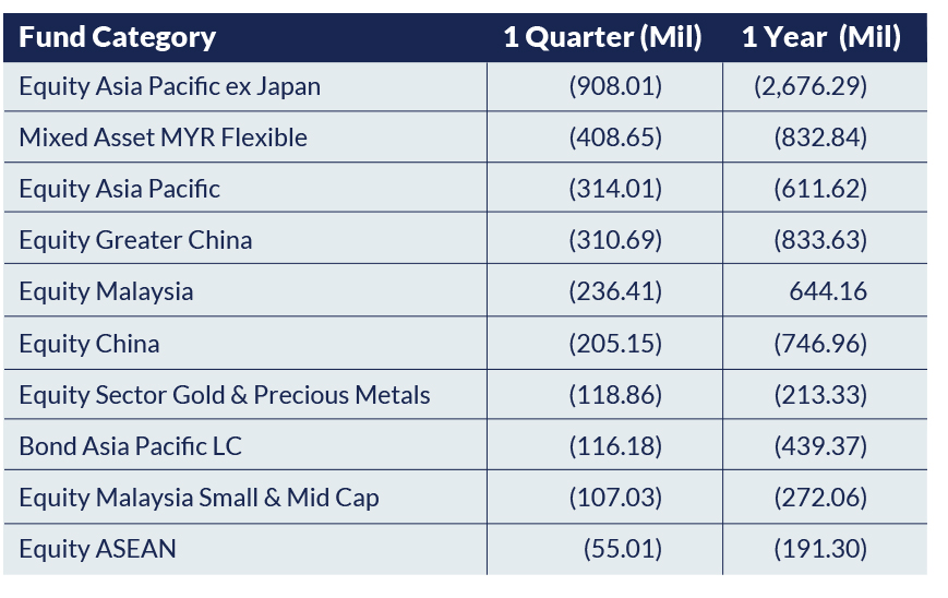 Over the past year, Asia Pacific and Asia Pacific ex-Japan equity funds led total outflows, recording a combined RM3.3 billion in redemptions. Greater China-focused equity funds also experienced significant net outflows, exceeding RM1.5 billion, highlighting ongoing investor concerns over China’s economic challenges and geopolitical tensions.