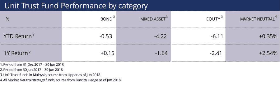 So far, volatility has been eroding returns in the market, as observed from the Malaysia All Unit Trust Fund performance, be it fixed income, equity, or a mixture of both, according to Lipper data as at June 2018. But market neutral funds in general had a more resilient perfor- mance over the past one year, according to performance data compiled by Barclay Hedge with a sample of approximately 90 funds.