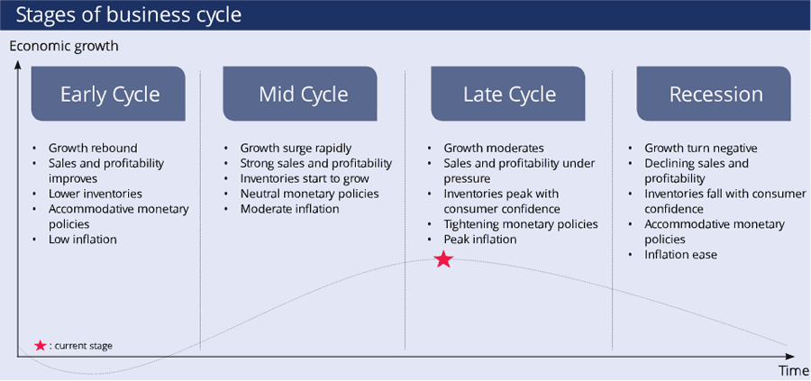 However, the monetarist approach believes that economic stages are driven mainly by the money supply, which is controlled by central banks. According to this view, the global economy is at the mid-to-late cycle as monetary policies are being tightened gradually. RHB Wealth Research team’s point of view is that the moderating growth and tightening monetary policies are all showing signs of being in the late economic stages, this combining with mixture of earnings reported in Quarter 2 (where some of the tech giants are reporting some disappointing figures) and higher inflation are showing signs of the late-business cycle. Therefore, the global market should be starting or about to embark its late business cycles now.