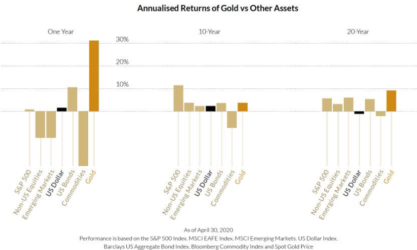 We can also see gold’s strength as a longer-term investment over 20 years, outperforming commodities and emerging markets.