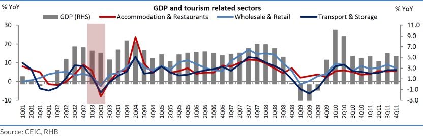 • Fiscal comparisons. In May 2003 the Government put in place a MYR7.3bn package of pro-growth measures as the SARS virus peaked in 2Q03. We think the quantum of the current stimulus ought to be bigger than in 2003 to the tune of MYR10bn after adjusting for inflation and growth of the tourism sector. We expect key initiatives to include reducing EPF contribution, targeting tax incentives, and accelerating the implementation of key infrastructure projects to achieve the maximum multiplier effect.