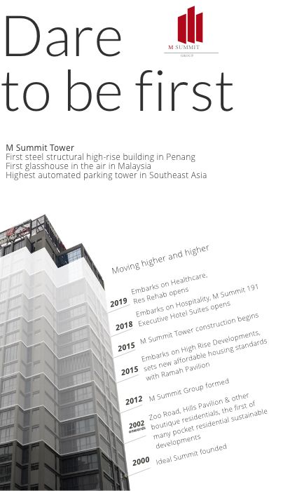 The M Summit tower is built on prime zero-mile land— the very centre of the capital city George Town—where land is scarce and split into lots too small for any major building construction. Today, on a lot no larger than 5,000 square feet stands the three firsts of the Moh family empire. It also houses two other new ventures into the service industry: Hospitality, with the M Summit 191 Executive Hotel Suites; and Medical Tourism, with Res Rehab, a centre of non-invasive medical healing.