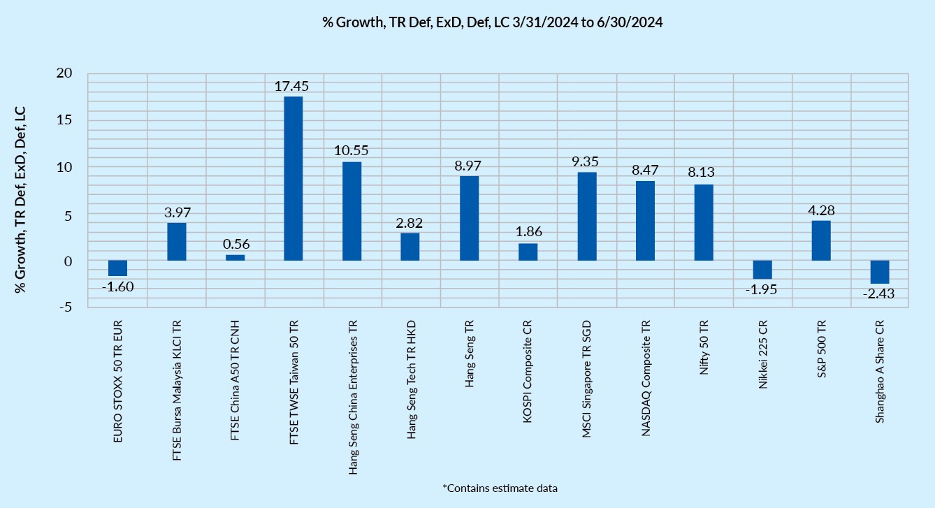 Up until the end of June, we saw a dynamic mix of opportunities and challenges. The Greater China market showed impressive performance in the second quarter, driven by the robust growth of the Taiwan equity market and Hong Kong-listed Chinese stocks represented by the Hang Seng China Enterprises Index (HSCEI). In stark contrast, the onshore Chinese equity market, particularly the Shanghai A Shares index, lagged behind major indices. Meanwhile, the US equity market continued to perform well, with other Asian markets like India, Singapore, and Malaysia riding the growth wave.