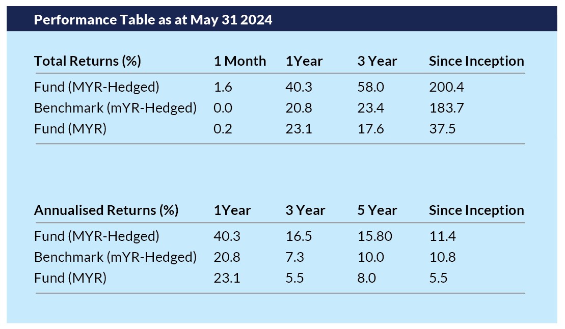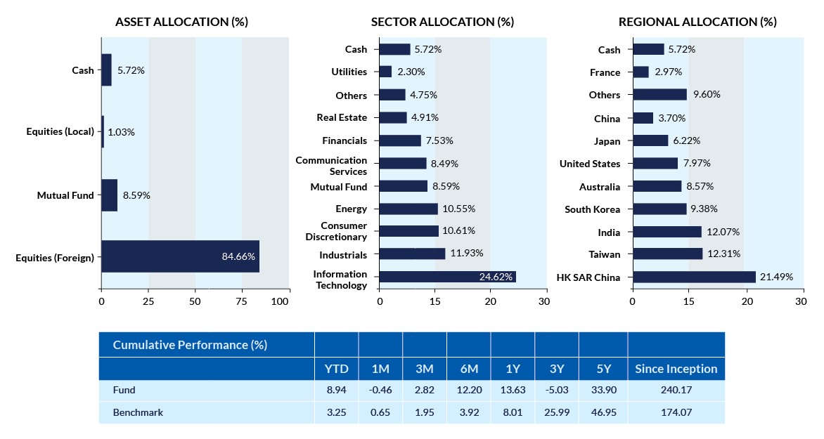 This fund makes our picks again because the KLCI is still an attractive entry point with plenty of room to grow. Investors can capitalise on major foreign companies like Google, Apple, Microsoft, ByteDance, and BlackBerry increasing their investments in Malaysia. The Malaysian economy is expected to grow 4-5% in 2024, driven by export recovery and domestic demand. The fund also diversifies into Taiwan, India, South Korea, and the US.