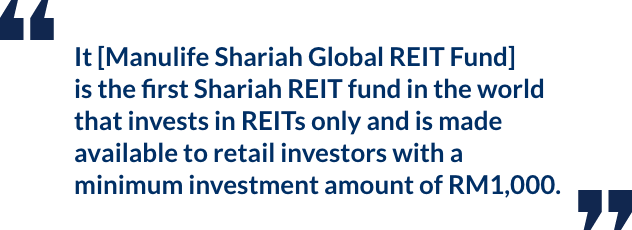 One way investors can capture this opportunity is to invest in the Manulife Shariah Global REIT Fund. Launched in March, it is the first Shariah REIT fund in the world that invests in REITs only and is made available to retail investors with a minimum investment amount of RM1,000.