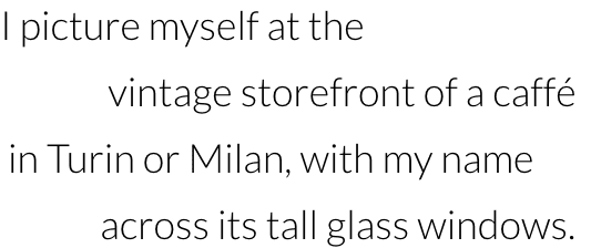 What will I do in retirement? Not going on cruises that’s for sure. I picture myself at the vintage storefront of a caffé in Turin or Milan with my name across its large glass windows, plaster walls and ceilings with a cosy setting inside, and a roasting machine in the basement. How these centuries-old establishments are so rich in history and style amazes me. They have been the place where famous artists, writers and intellectuals, even political icons, once congregated… they were where conversations created revolutions.