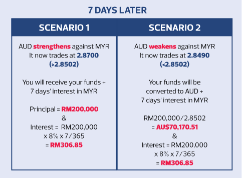 During the tenure, if the target currency strengthens, the entire investment amount and the fixed yield will be given back to the account holder in the base currency. But if the target currency weakens, the investment amount will be converted to the target currency and a fixed yield will be paid to the account holder in base currency.