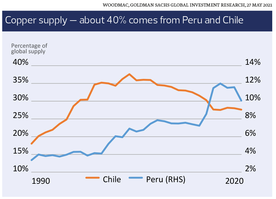 Other hurdles might impede the increase in the supply of copper. For instance, the uncertain investment backdrop in Chile and Peru is due to political changes. Both countries contribute a combined global copper output of nearly 40%. A lack of new investments and delay in the reopening of idle mines in the two countries will further exacerbate the current undersupply and provide more momentum to copper price increases.