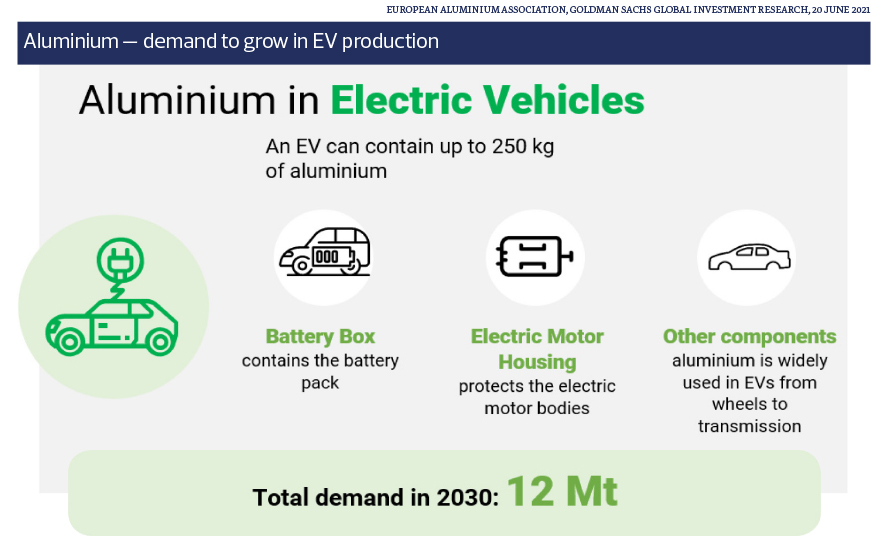 In EVs alone, the European Aluminium Association expects that manufacturers will require 250kg of aluminium per EV in the future and annual demand from the EV sector will amount to 12 million tonnes of aluminium by 2030.