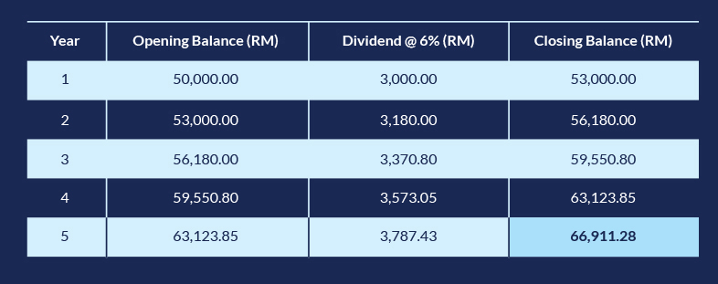 After 5 years, the RM50,000 grows to approximately RM66,911, even without additional contributions.